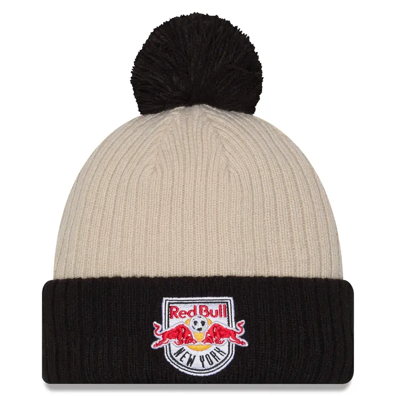 Men’s New York Red Bulls New Era Khaki/Black 2025 Jersey Hook Cuffed Knit Hat with Pom